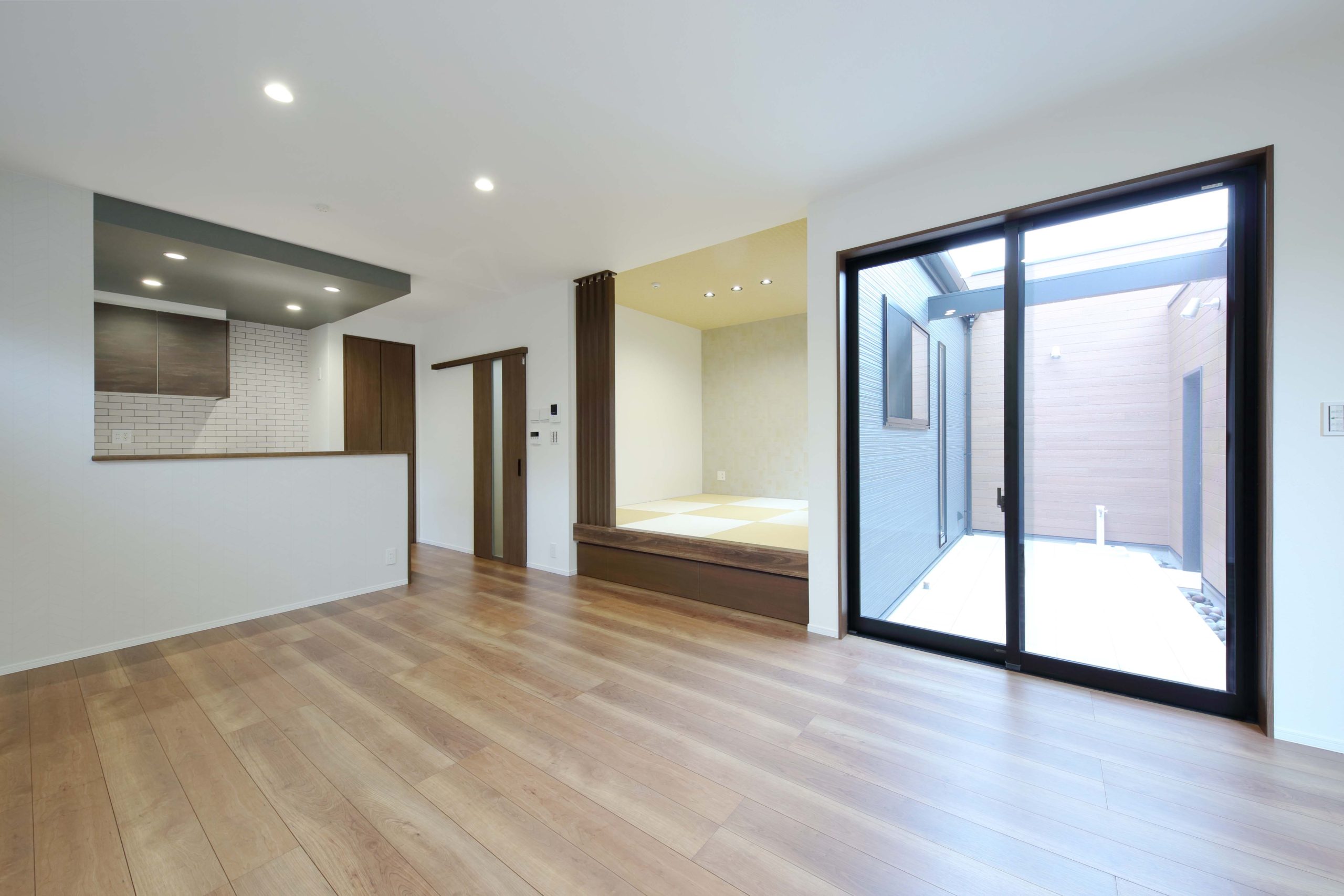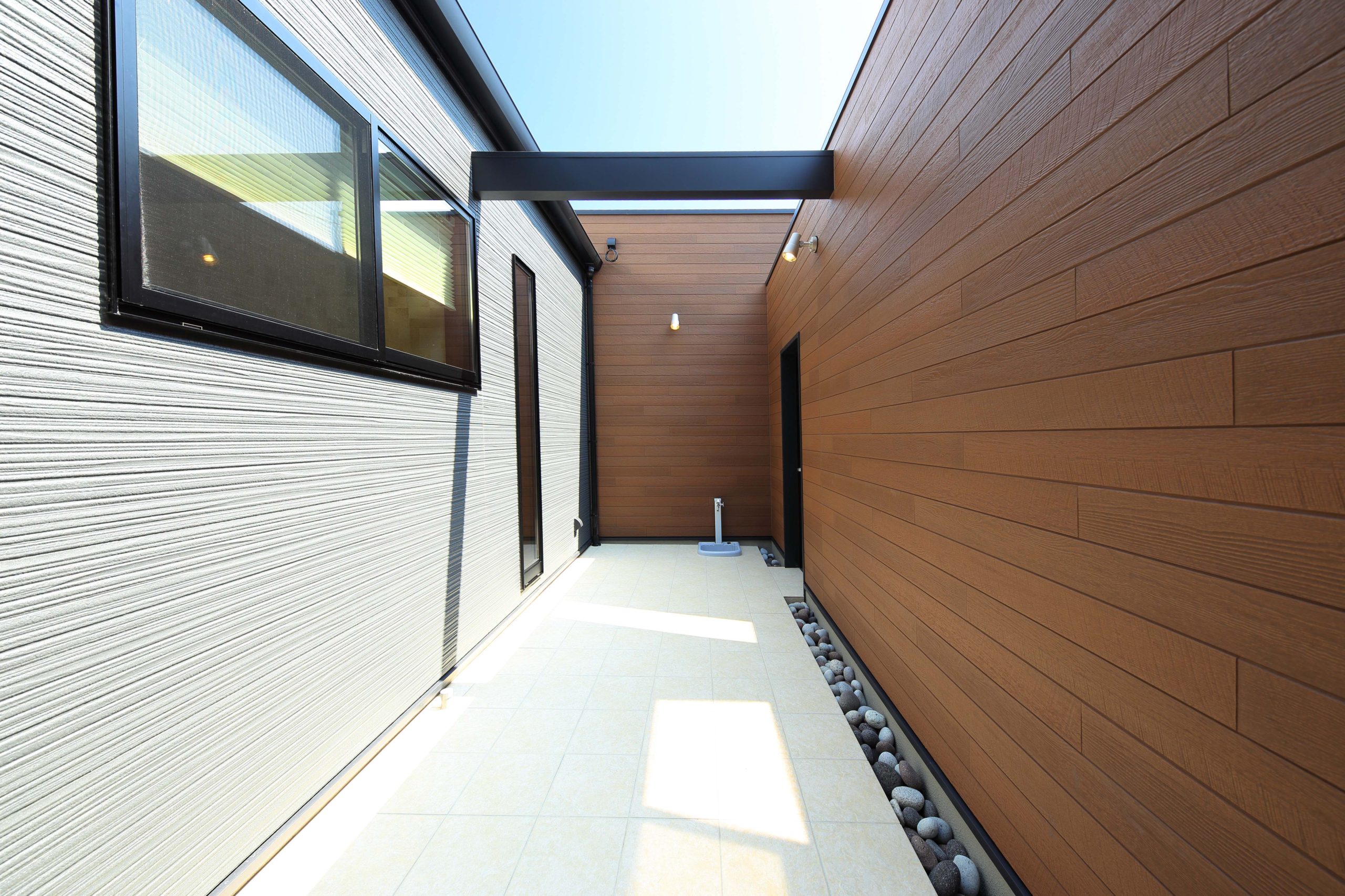 外観からは想像がつかない中庭空間。お子様がのびのび遊べるよう、リビングからも目が行き届き光が差し込む中庭を。