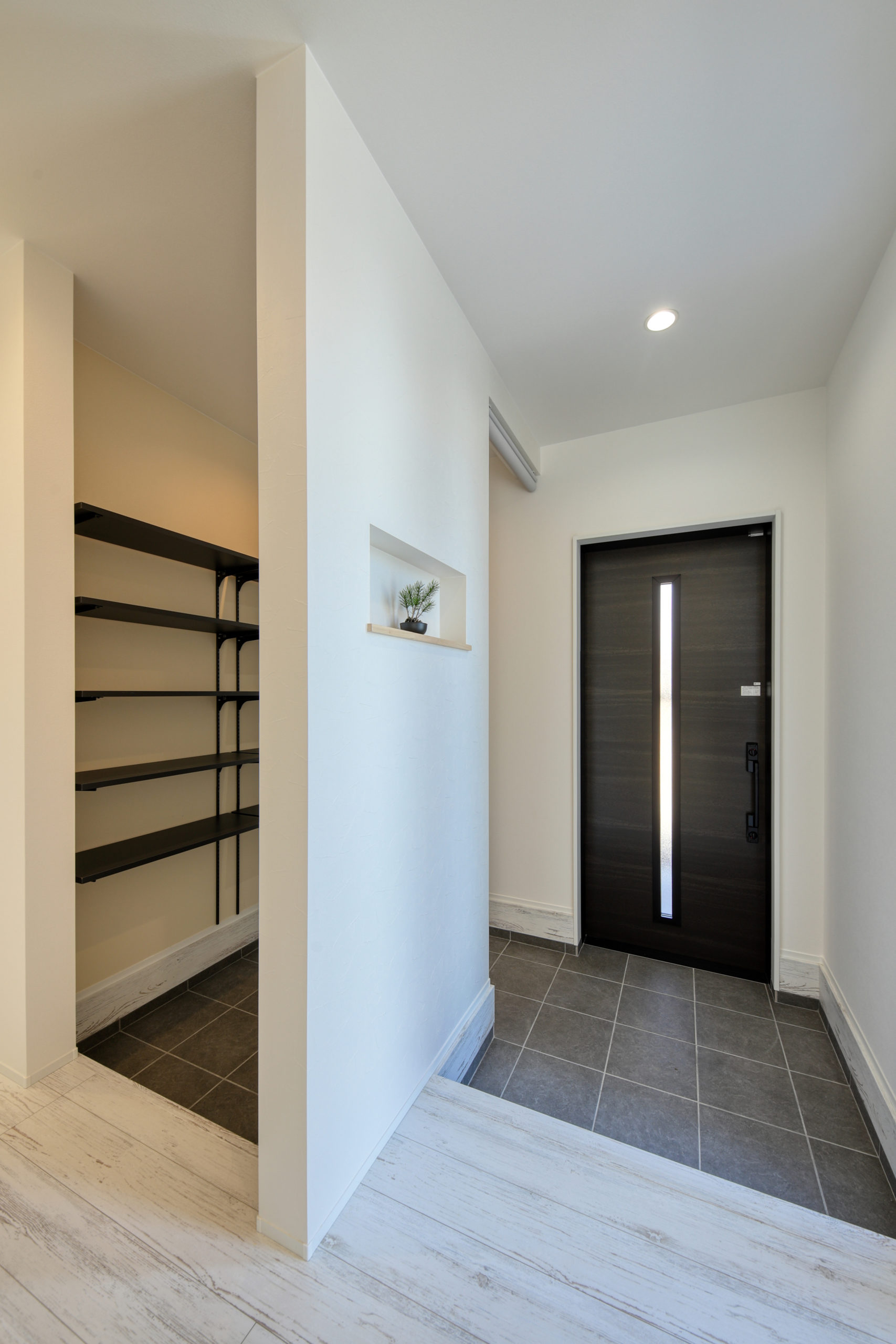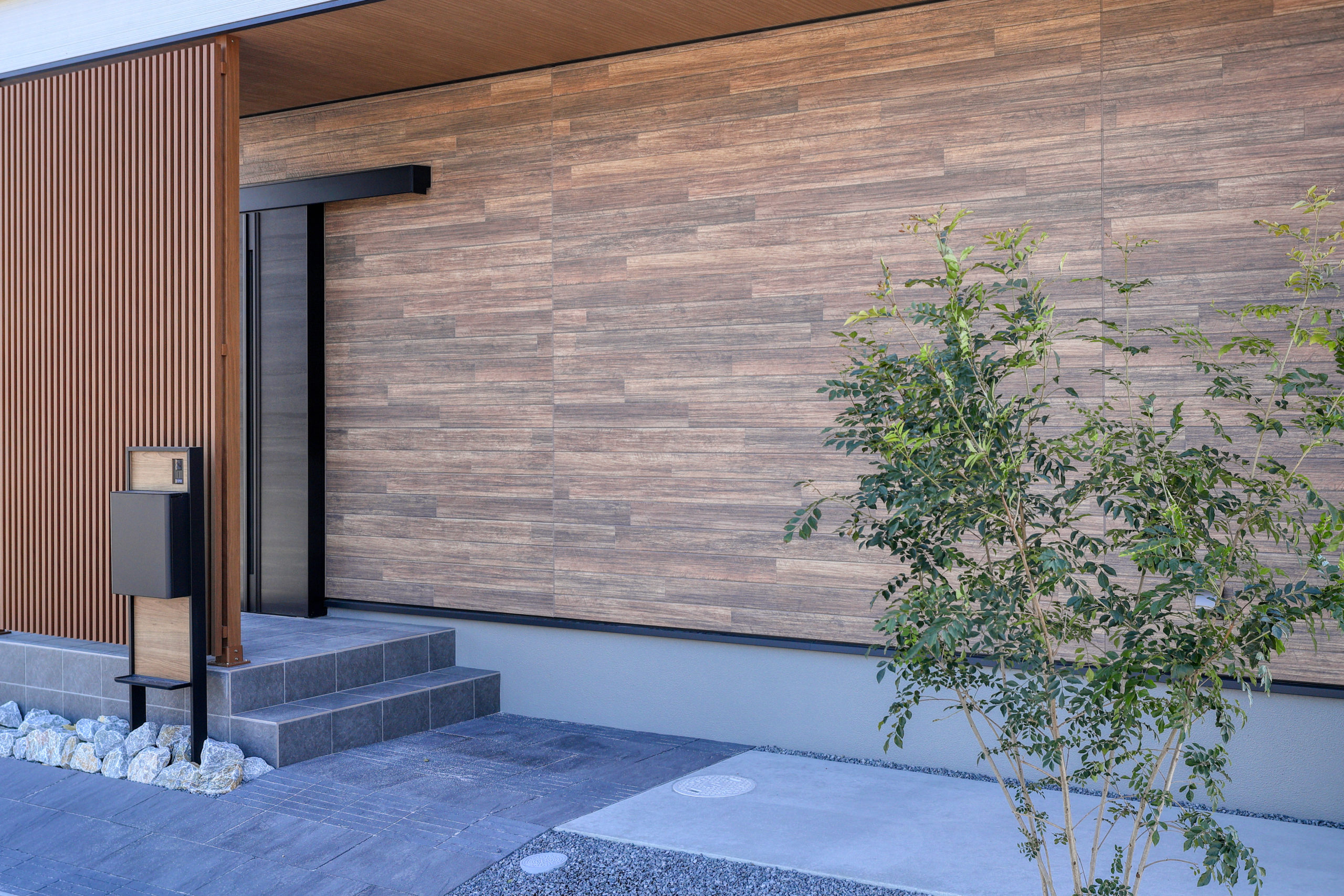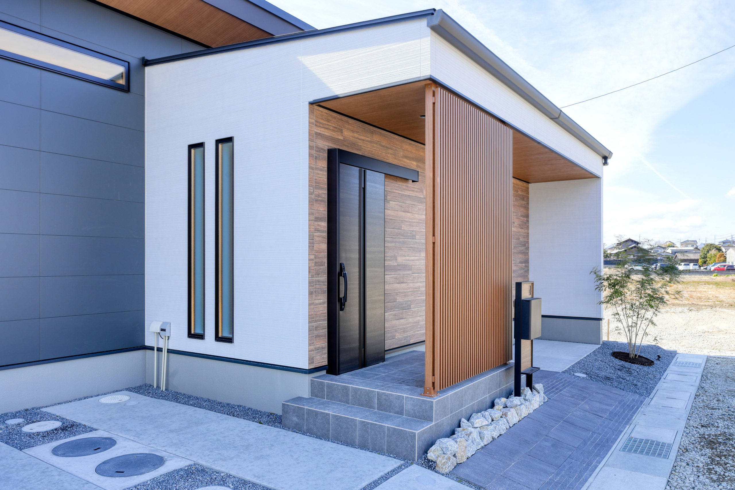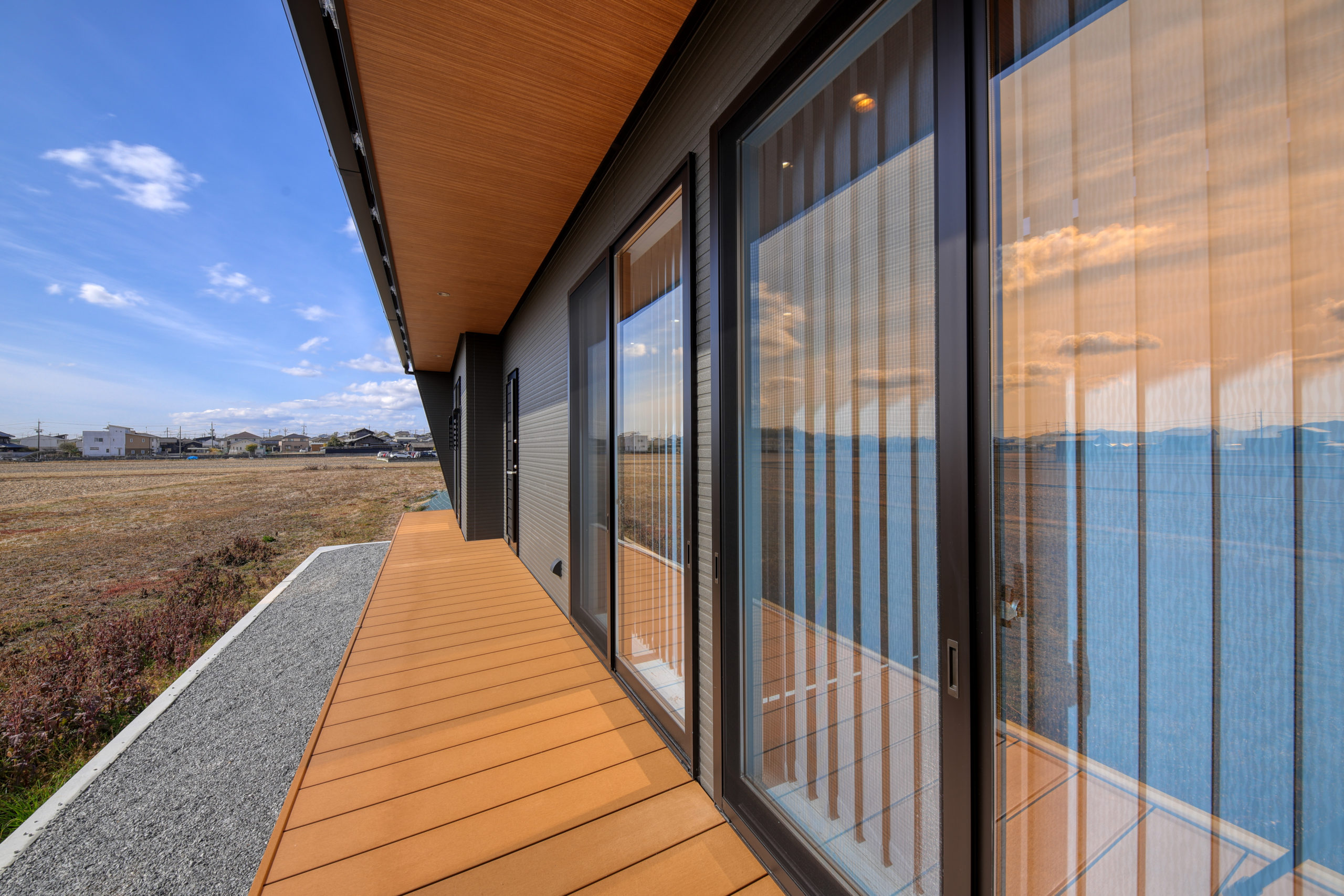 田園風景に建つ、平屋のお住まい。外観は黒を基調に、木調のサイディングがアクセントに。人の視線も生活感も気にせず、暮らせるカッコイイ家になりました。